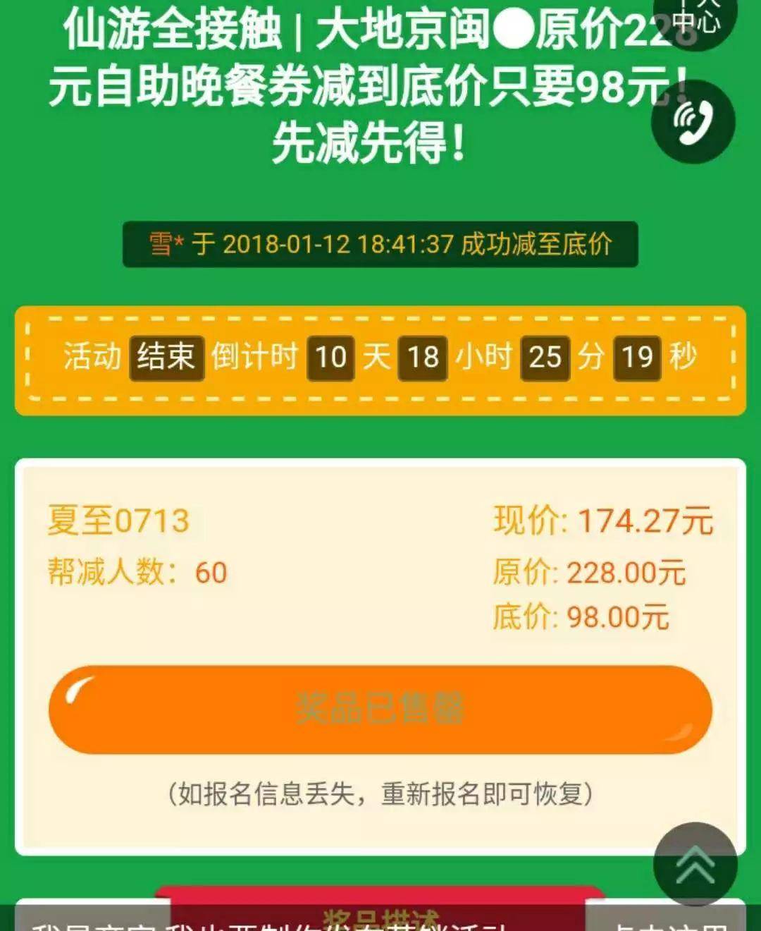 是一个自助海鲜策划的一个促销砍价活动,只要你找到足够的人就可以从225元砍到98元。活动很成功,短短的时间内就有大量的人参与,奖品全部售馨。很多品牌都在用,说明这种促销的策略是有效果的。