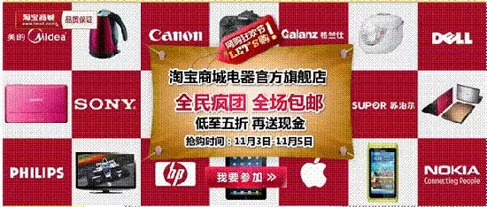 尝到了"双11购物节"的甜头,更多的商家参与了淘宝商城2010年双11半价包邮活动。淘宝官方为了准备购物街,联合营销公司制作了9款不同风格广告创意以匹配不同形式产品以及活动,提前10天为双11造势。