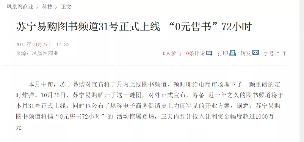 举个例子,苏宁易购开设图书频道,推出"0元售书72小时"活动,此举引发京东商城、当当网跟风降价。当日,当当网推出图书"满100返200,最高返400"的促销活动,而京东则在图书频道挂出了"百种畅销经典名著,泪奔谷底,4折封顶"大幅促销广告。