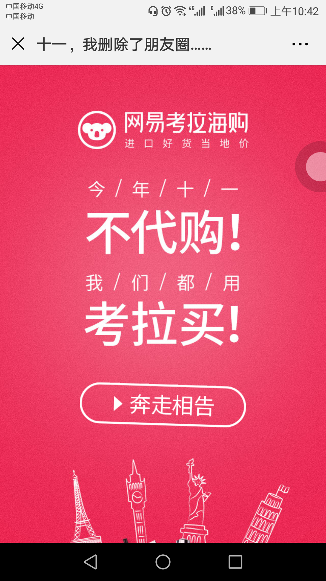 国庆期间去海外度假,都会忍不住拍些照片发个朋友圈,可不料一发朋友圈,却面临“度假变代购”的窘境。网易考拉海购针对用户这个痛点,将度假代购制作成一个H5进行传播,通过微信聊天,将各种奇葩的求代购场景演绎出来,引起用户共鸣,必须转发一波表达自己“十一不代购”的立场,因此,这支H5也实现十一期间刷爆朋友圈的效果。
