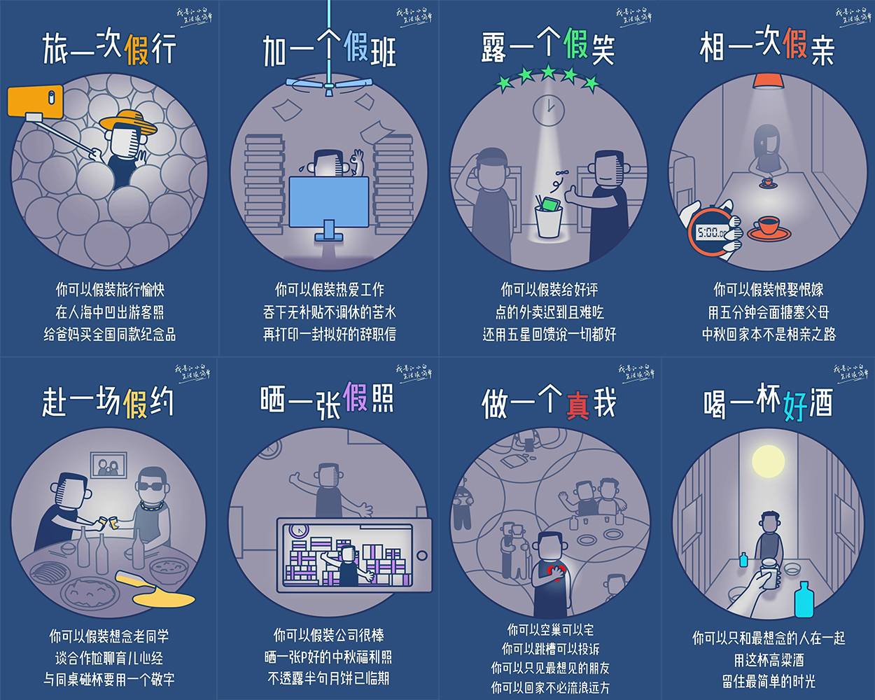 在这组文案中,江小白先罗列出年轻人假期中的种种无奈,继而发挥出文案的优势,给出年轻人种种释放自我的建议,对症下药。