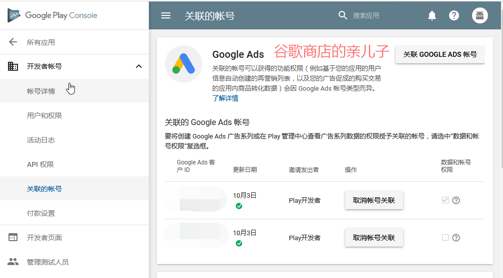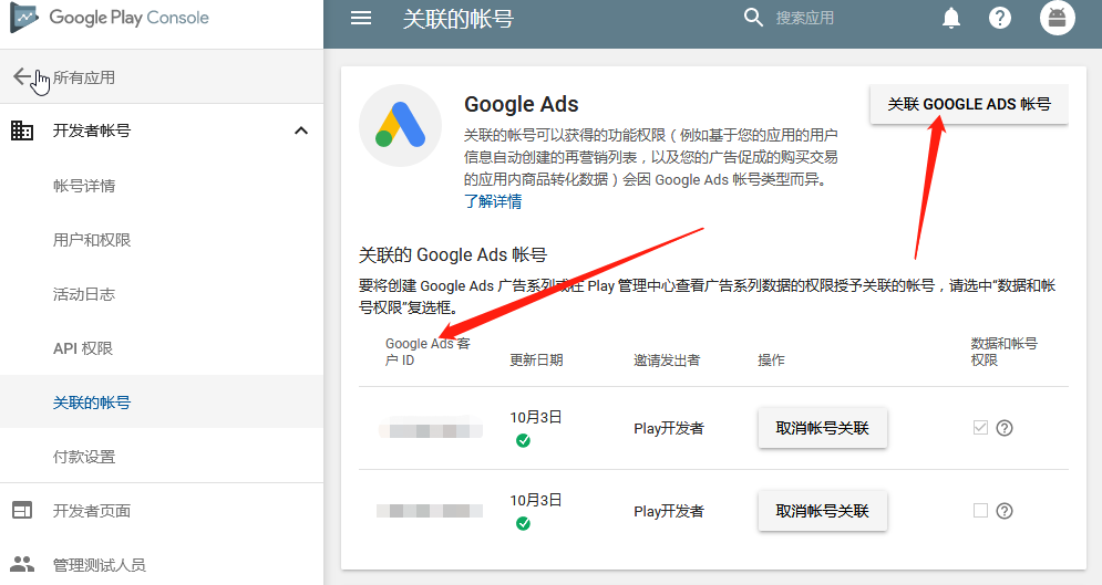 (2)在谷歌开发者后台中与“Ads经理账号的客户ID”相关联