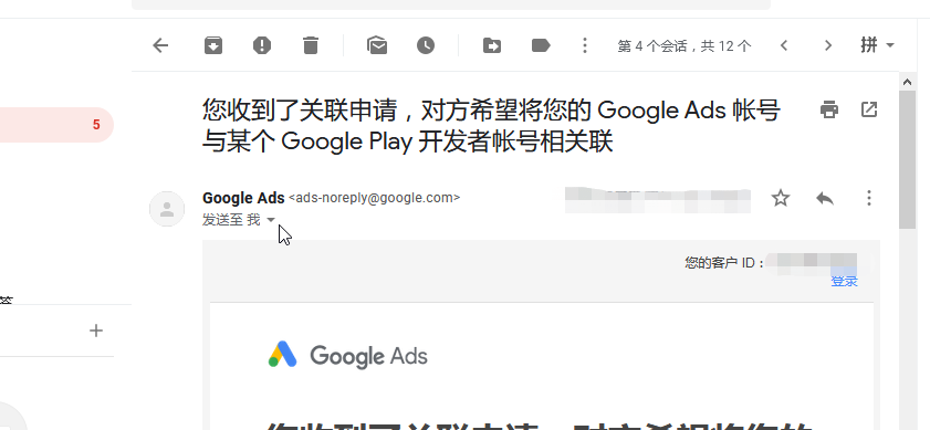 如图所示,在开发者后台提交关联申请后,你用于Ads投放的谷歌账号的电子邮箱内会收到请求关联的申请,点击确认即可。