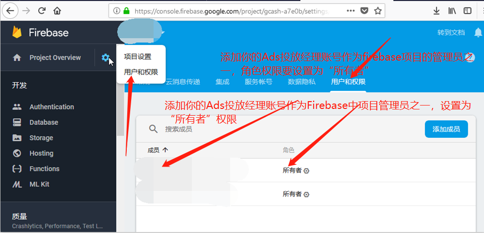 在该项目中,添加你的Ads投放经理账号作为Firebase中项目管理员之一,并将其设置为“所有者”权限。其中的“Ads投放经理账号”顶级代理商会给你配置好的(不懂的,参考上面)