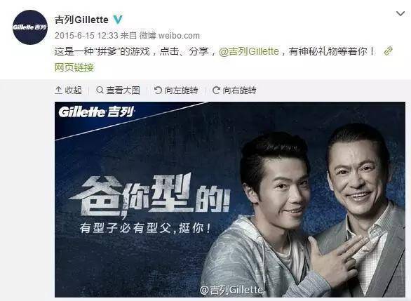 比如有关父亲的话题,总会有无尽的回忆,每个人的记忆里都有自己父亲的背影,温暖温馨的,煽情催泪的。比如之前感动全球的那个台湾父亲撑伞照,世界上最美的背影,深深的父爱。但作为品牌在借势的时候,不能只是从给父亲礼物的角度,这样就太流于俗套了。吉列在父亲节策划了晒父亲、秀父子照、年代照的主题活动,发起话题或者参与话题,并且做成H5的小游戏,让大家一起生成图片分享。