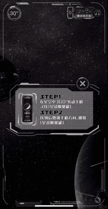 但这一次的包装不仅停留在“看”的阶段,百事可乐还为其定制了一款星战主题H5。通过扫描二维码,手机屏幕将变为科幻感十足的星空,旋转手机找到限量罐可以测试出你和星战中哪个角色最匹配。