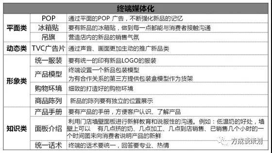 终端不应该只是新品销售的渠道,更应该将终端打造成新品的推广的媒体,通过对终端整体布置,在和消费者的每一个接触点上,新品都与消费者“沟通”。提升新品的在终端的销售效率,终端媒体化通长会用到的工具,如下表: