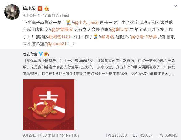 但我们万万没想到的是,原本稳坐锦鲤宝座的几位娱乐明星,突然被素人“信小呆”截胡。在支付宝十一出境游的营销活动中,信小呆成为全民盖章确认的中国锦鲤。支付宝这条“祝你成为中国锦鲤”的微博不到六小时转发量破百万,周累计转发破三百万,惊人的数据成就了其企业社会化营销史上上的巅峰地位:最快达成百万级转发量以及总转发量最高的企业传播案例。