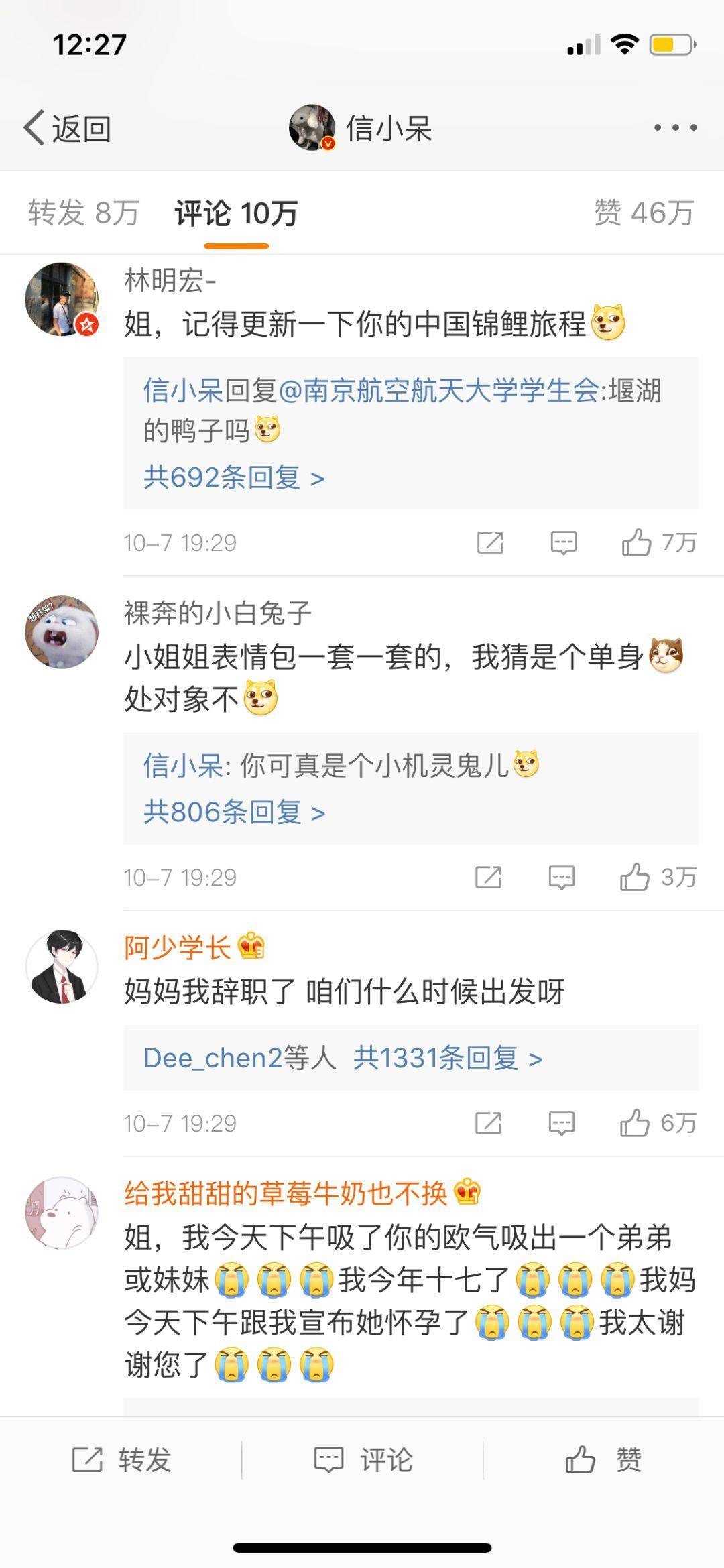 开奖之后,我们在信小呆微博下面领略了大型围观现场,她的短视频采访成为新一轮社交话题,关于之后她的开箱体验、旅行直播等等,一环接一环。信小呆从一个一千粉丝以下的素人,短时间内成为了百万粉丝的语境符号。