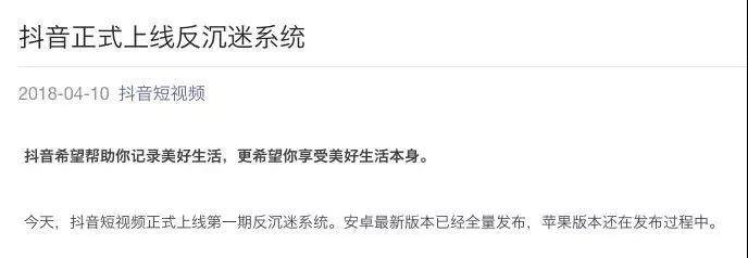 但是某些权威媒体、自媒体在没有任何调研和佐证的情况下,利用个人情绪,带有攻击性、煽动性语言在网络上进行传播,很容易中伤到抖音。我们需要空杯心态,抖音在改变和优化阶段,即将上线的用户防沉迷、反低俗系统,再到慢慢剔除不良内容。