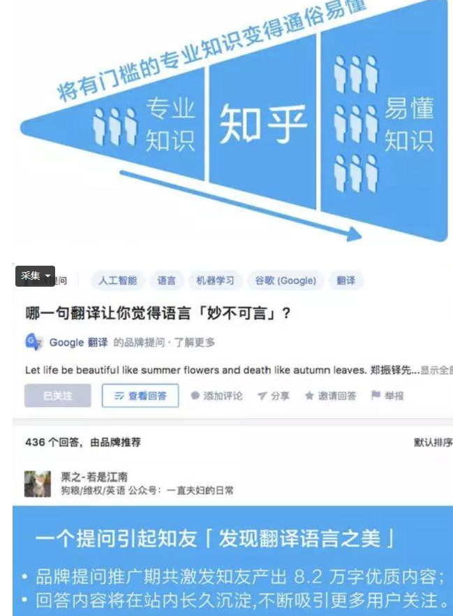 相比高冷的「机器翻译」话题,「人工翻译」更加通俗易懂。因此,在知乎平台,谷歌扮演者传教士的角色,首先从文学、语言表达等站内讨论活跃的话题切入,先通过强互动产品「品牌提问」与知友建立链接并激发兴趣,之后在与知友不断互动的同时,由浅入深地对照「人工翻译」输出「机器翻译」内容。