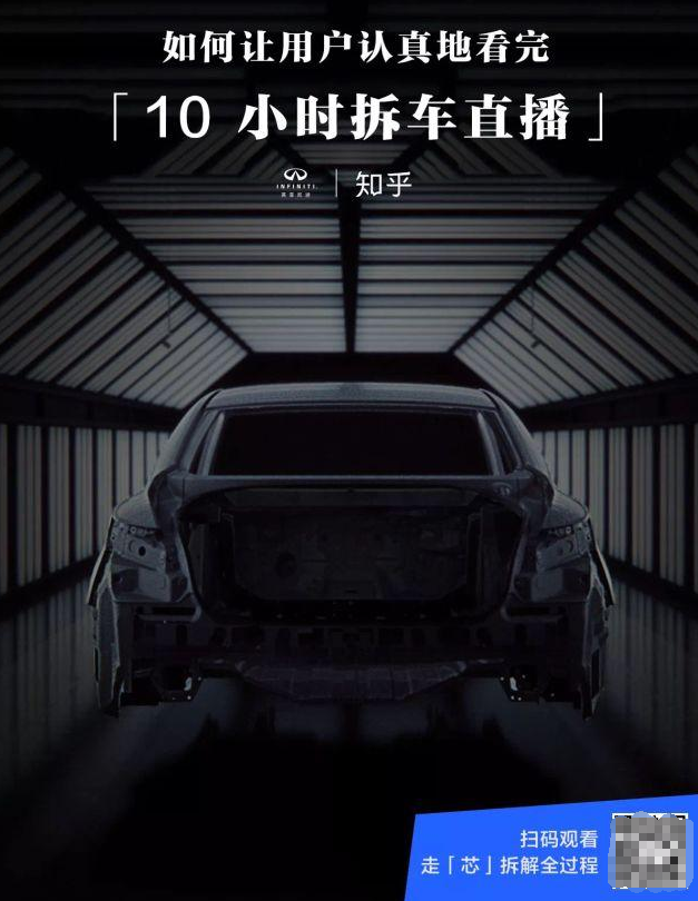 在创意落地上,英菲尼迪选择了时下流行的直播手段,以最直白的方式直面用户,使产品展现更为直观,便于加深用户理解,于是这场依托于知乎「知识直播」的10小时不间断震撼拆车就正式上线了。