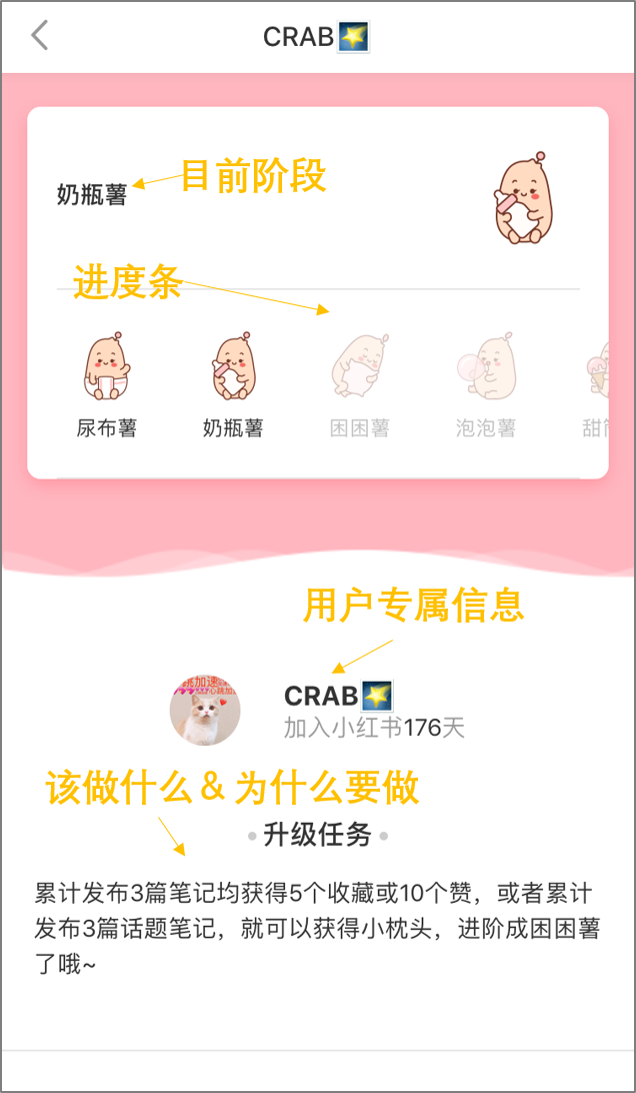 进度条显示所有的形象图标,并将已解锁的形象点亮。那些还未被点亮的形象起到了暗示引导的作用,激励用户进行下去;通过文案清晰地告知接下来的任务,以及完成任务后即可解锁的小红书形象。