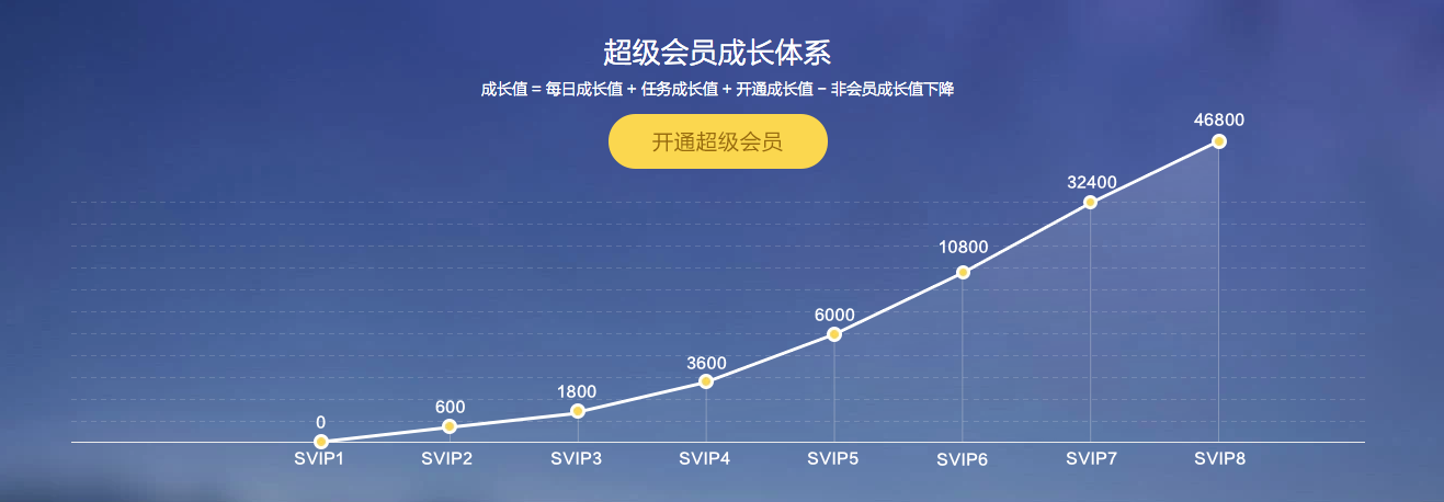 交易型产品的用户成长模式,通常以【持续活跃->业务消费】为核心目标。在用户完成特定任务后,给予一定经验值,经验证的累计数值对应用户成长等级,等级对应不同权益。以QQ会员成长体系为例: