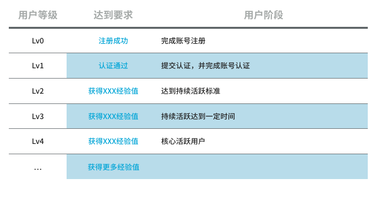 根据不同的任务,给予用户一定的经验值鼓励。如完成新手任务一条获得10个经验值,完成日常任务获得5个经验值,完成主线任务获得20个经验值。如下表是用户成长等级划分的示例: