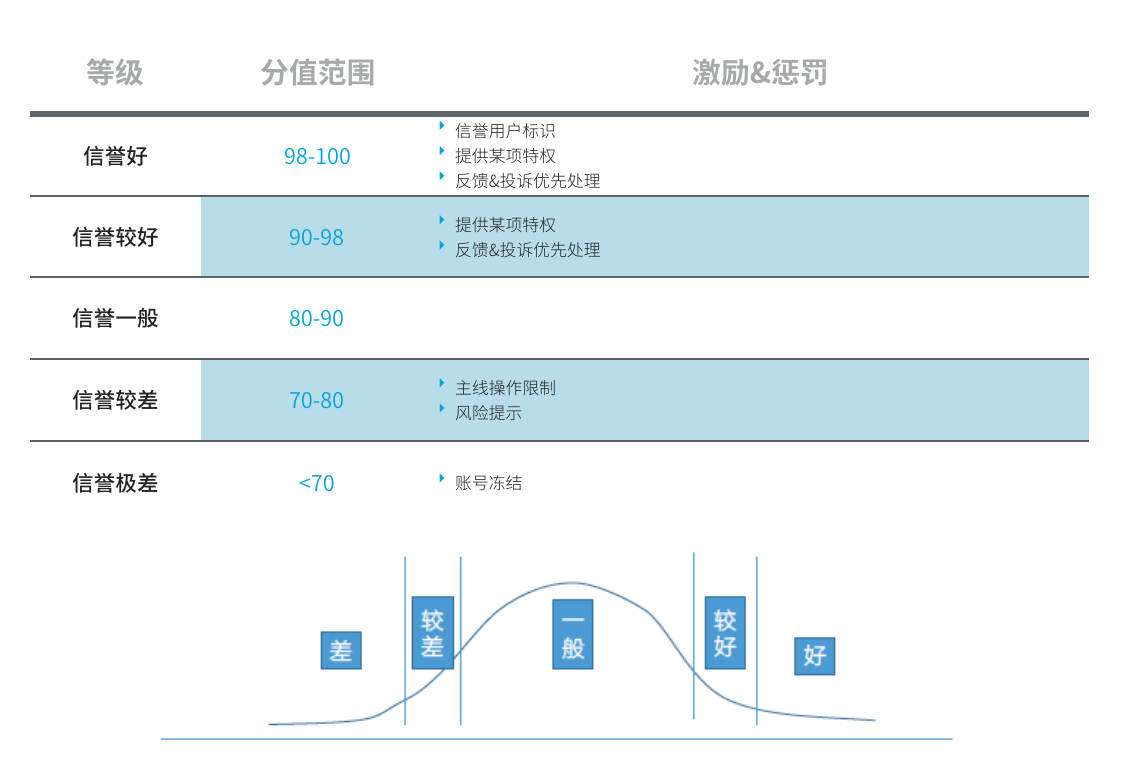 用户信誉体系的作用是完善核心业务运营的策略并指导用户更好的完成交易。信誉指标的搭建,其目的是为了规范用户的交易行为,将用户行为标准化,提高其扩展性。