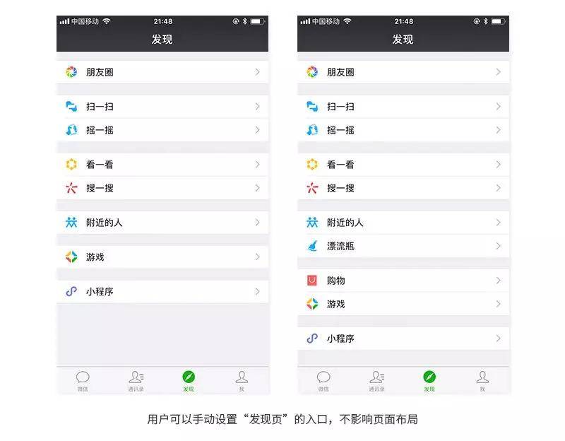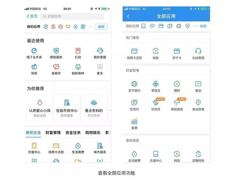 就像上面提到的两种布局方式,在列表式布局中你可以随意添加新功能,但是碍于空间,可添加的功能数目也不会太多。宫格式布局倒是不怕入口放不下,但是会引起界面的失衡。