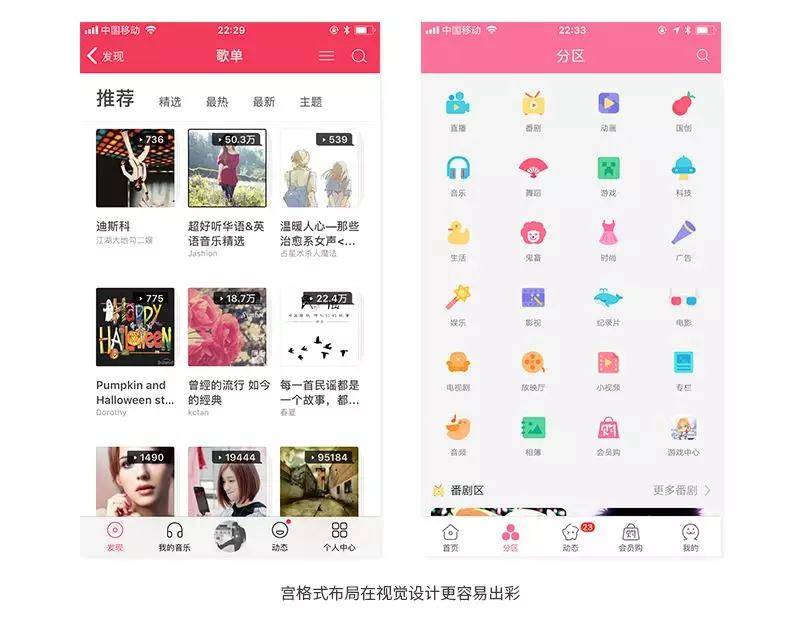不知道大家有没有注意到一个现象:一级页面中主要用宫格式布局,而二级、三级页面多数用列表式布局。