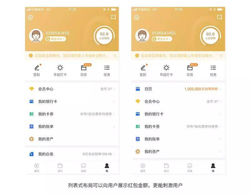 列表式布局可以向用户传递更多的信息,更能表现内部状态的变化。以下图为例:用户可以知道自己还有一张优惠券没有使用,知道自己本月还有126元没还。而宫格式布局碍于空间,很难向用户展示过多的信息。