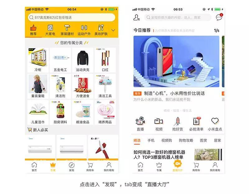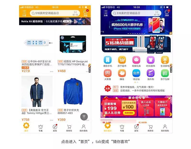 没有什么是可以难倒我们设计师的,最近我看到一些产品在底部栏tab里动起了心思。以苏宁易购为例:当你点击进入“发现”,tab会变成“直播大厅”;点击进入“首页”,tab会变成“猜你喜欢”。