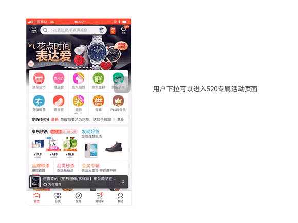 还有在京东首页中,用户下拉会进入520专属活动页面。同样的还有微信,用户下拉直接显示你最近打开的小程序。