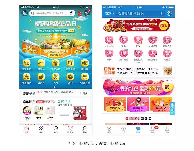 从这个方面来说,我们可以发现:为什么宫格式布局更容易受到各大电商平台的青睐。因为它可以根据不同的活动配置一套完全不同的icon,灵活多变。这种状态上的百变来打造营销氛围的能力是列表式布局所不具备的。