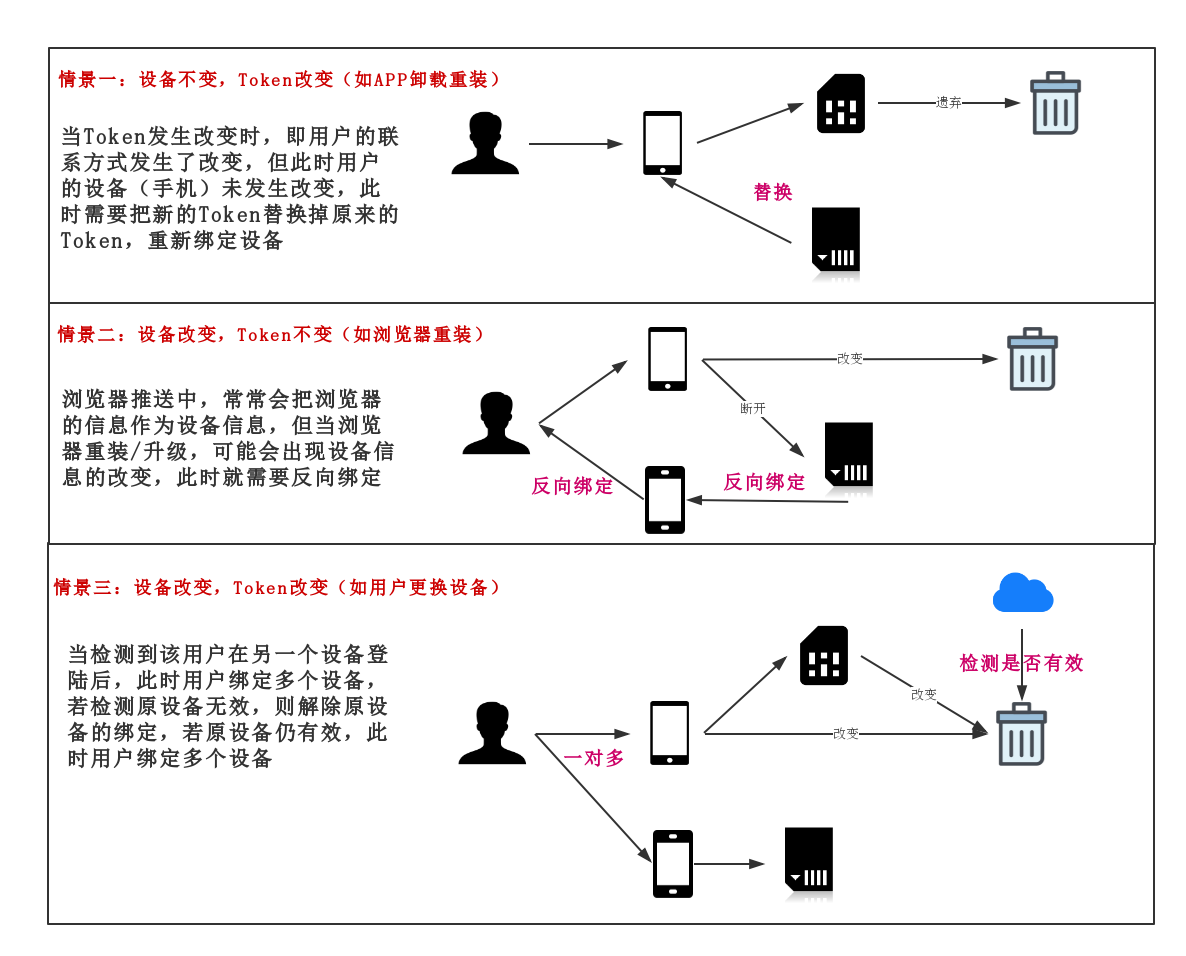 当设备发生改变,Token发生改变时,使用新的设备(及其对应Token)绑定用户,同时旧设备可做有效性检测(如模拟发送测试等),若旧设备无效则解除与用户绑定。