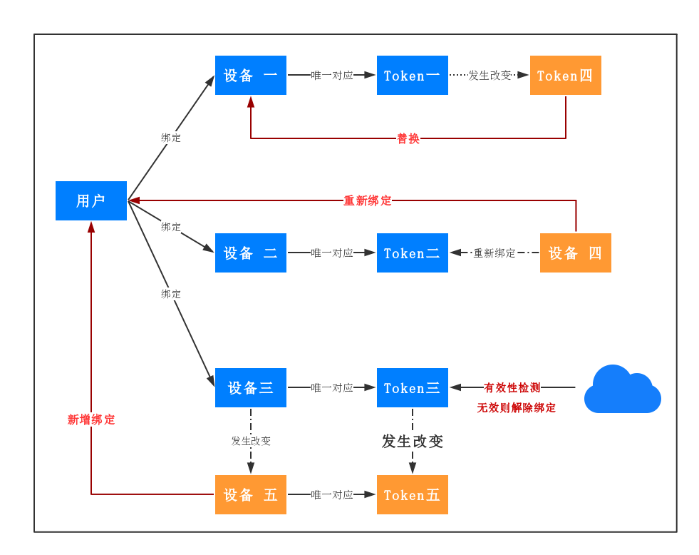 当设备发生改变,Token未变时,则用新的设备绑定旧Token及用户。