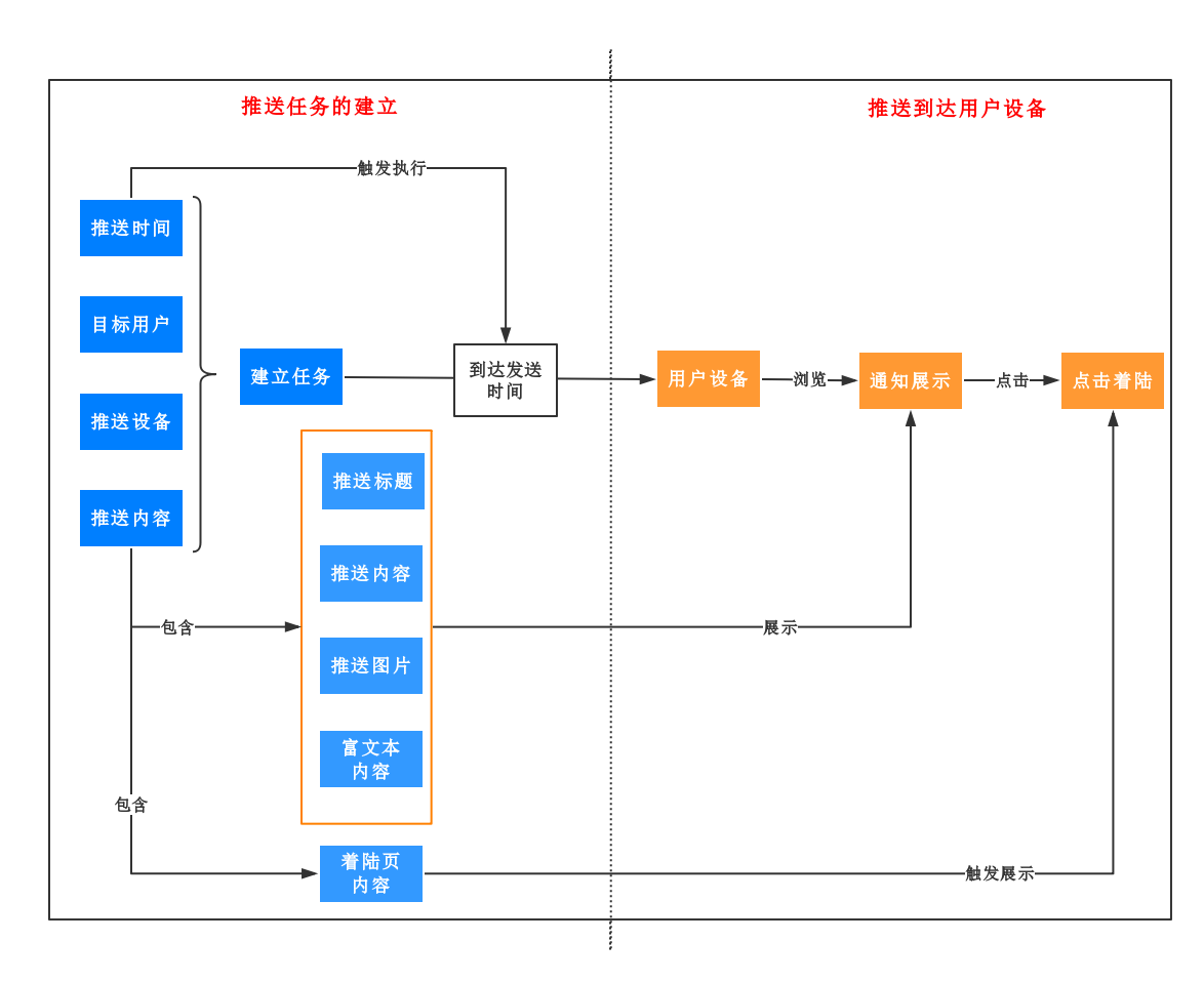 梳理上述内容及推送任务之间的关系,可以从下图中看出来,设置发送时间,将会作为任务执行时间,而发送设备决定了用户在哪个设备上接受什么类型的消息。发送内容中的通知信息将会在用户的设备上的通知栏展示。设置着陆页将会是用户点击之后跳转的页面。