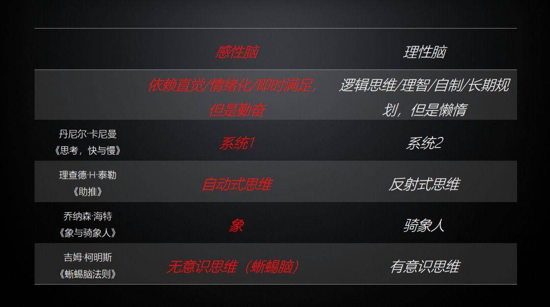 • 理性脑是反射式、有意识思维系统,掌管人的逻辑思维、理智、自制、长期规划等高级思维能力,但是非常懒惰;