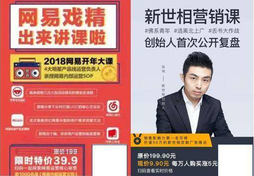 • 新世相营销课——原价199.90元,起步价9.90元,每万人购买涨5元,3小时卖出90000多份;