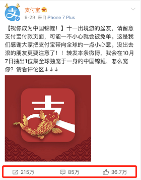 支付宝的中国锦鲤是一次极为成功的营销,从数据层面看,支付宝的单条微博6小时转发超100万,总计阅读量超过2亿,转发量超200万,据说打破了微博的转发量和转发速度记录,那么,支付宝的这个活动是如何火的呢